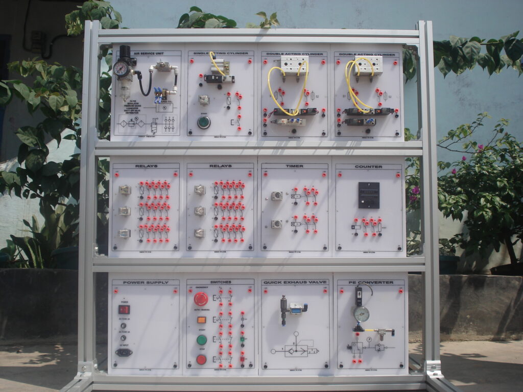 Trainer otomasi berbasis PLC dan sistem kendali udara, mendukung pembelajaran industri 4.0 dan kontrol otomatis.